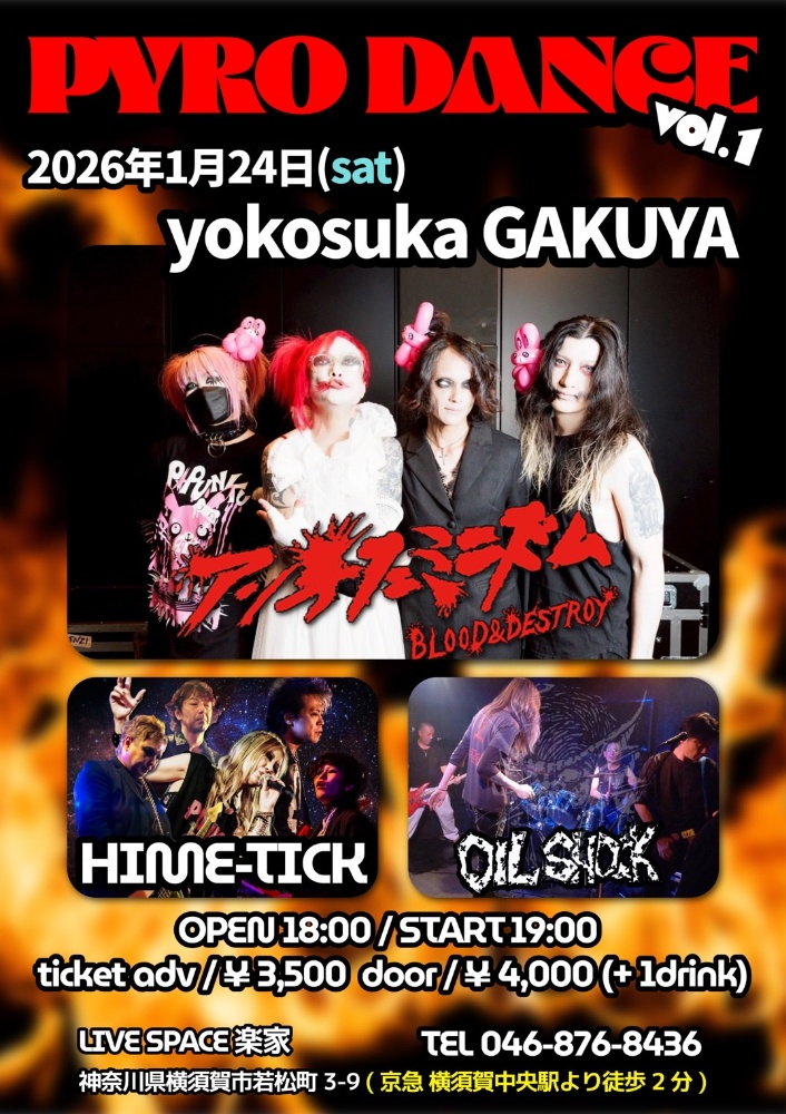 PYRO DANCE vol.1 OPEN 18:00 / START 19:00 前売り 3,500円 / 当日 4,000円 (+1drink) ▼出演 アンチフェミニズム HIME-TICK OIL SHOCK ▼チケット バンド予約あり ▼問い合わせ LIVE SPACE 楽屋 046-876-8436 |