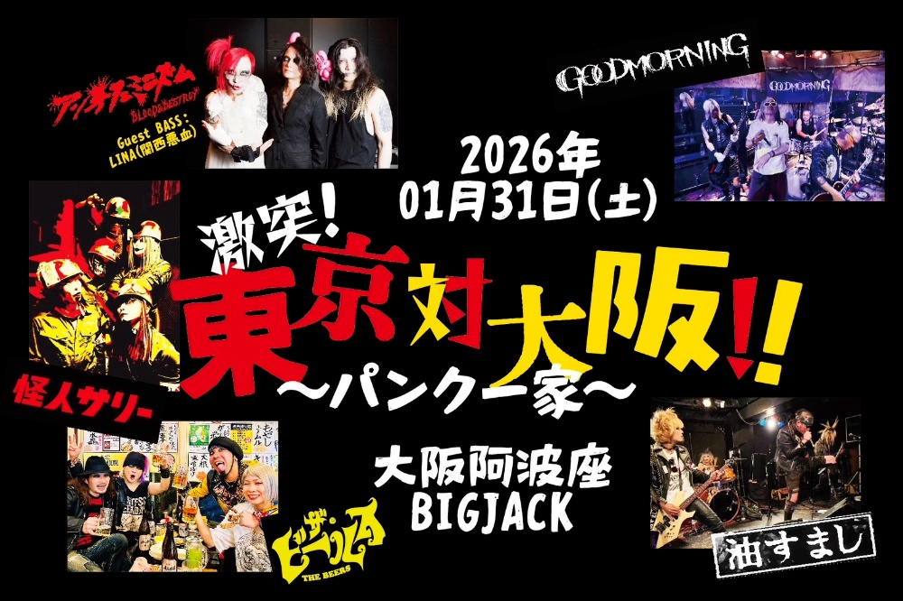 激突!東京対大阪!! 〜パンク一家〜 OPEN 18:00 / START 18:30 前売り 4,000円 / 当日 4,500円(+1D) ▼出演 〇東京組 アンチフェミニズム ザ・ビールス 怪人サリー 〇大阪組 GoodMorning 油すまし ※記念ステッカープレゼント ▼チケット バンド予約あり ▼問い合わせ 阿波座BIG JACK jack69you@gmail.com |
